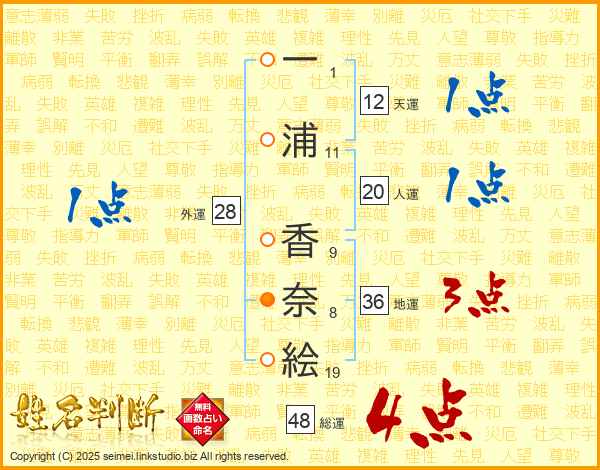 一(1画)浦(11画) 香(9画)奈(8画)絵(19画)