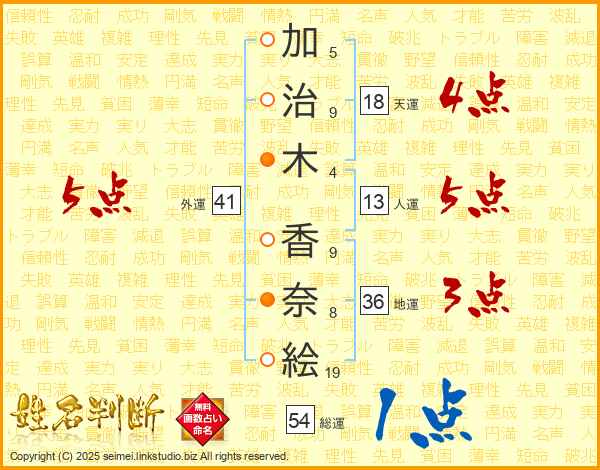 加(5画)治(9画)木(4画) 香(9画)奈(8画)絵(19画)