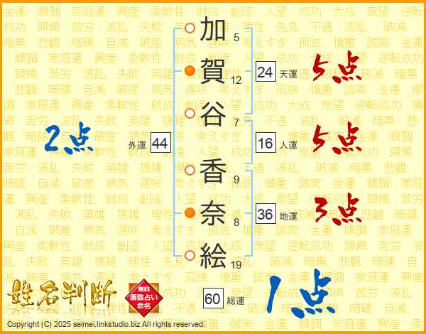 加(5画)賀(12画)谷(7画) 香(9画)奈(8画)絵(19画)