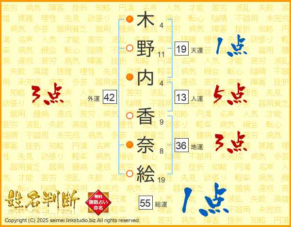 木(4画)野(11画)内(4画) 香(9画)奈(8画)絵(19画)