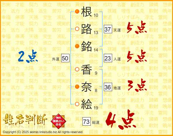根(10画)路(13画)銘(14画) 香(9画)奈(8画)絵(19画)