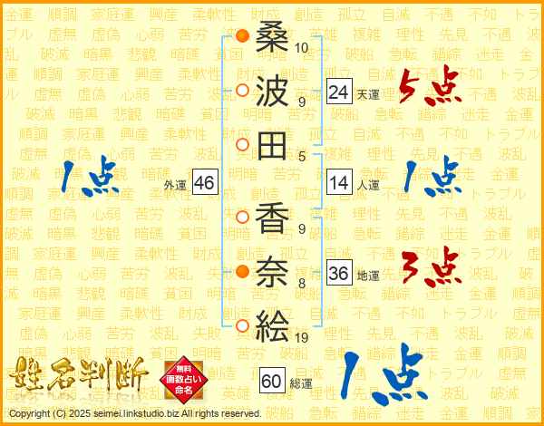 桑(10画)波(9画)田(5画) 香(9画)奈(8画)絵(19画)