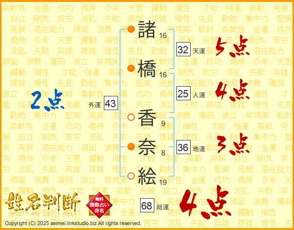 諸(16画)橋(16画) 香(9画)奈(8画)絵(19画)