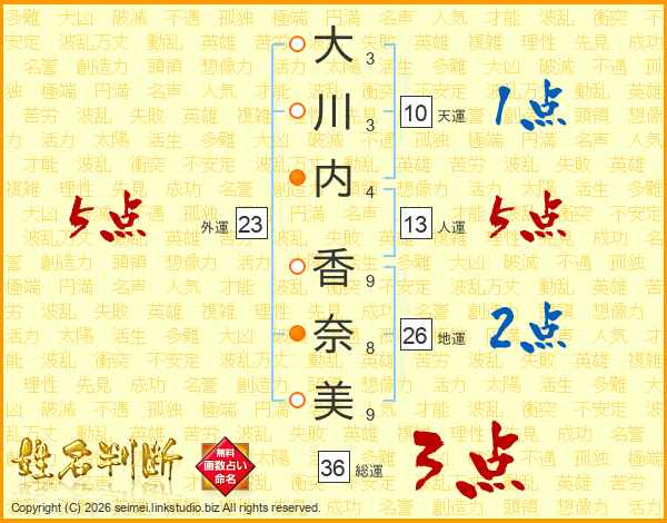 大(3画)川(3画)内(4画) 香(9画)奈(8画)美(9画)