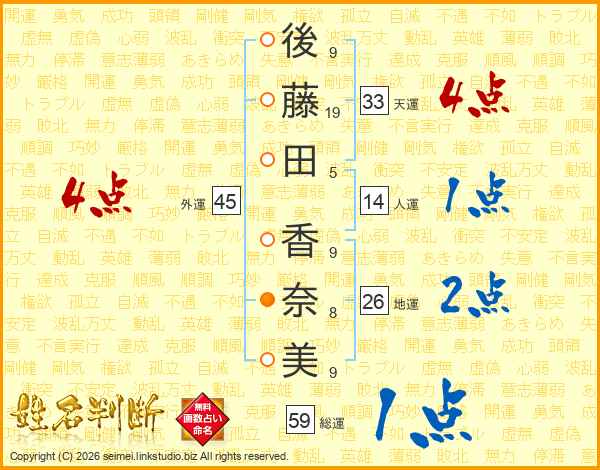 後(9画)藤(19画)田(5画) 香(9画)奈(8画)美(9画)