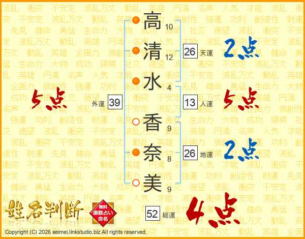 高(10画)清(12画)水(4画) 香(9画)奈(8画)美(9画)