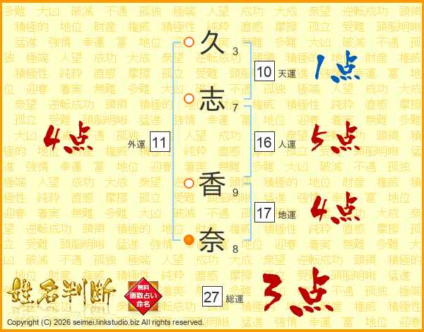 久(3画)志(7画) 香(9画)奈(8画)