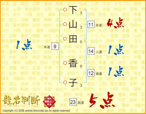 下(3画)山(3画)田(5画) 香(9画)子(3画)