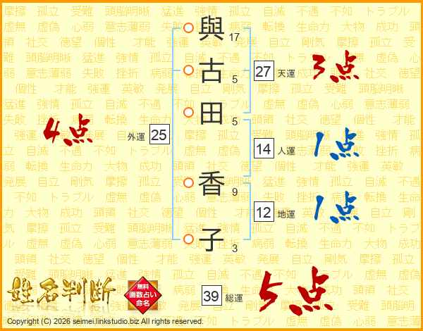 與(17画)古(5画)田(5画) 香(9画)子(3画)