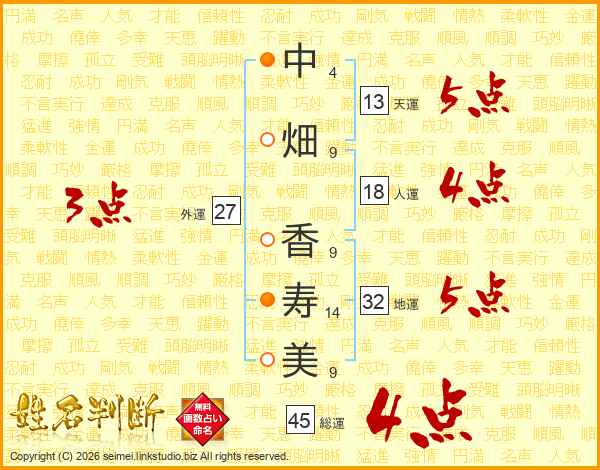 中(4画)畑(9画) 香(9画)寿(14画)美(9画)