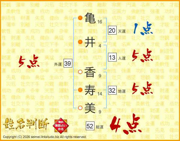 亀(16画)井(4画) 香(9画)寿(14画)美(9画)