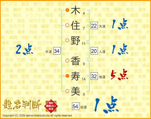 木(4画)住(7画)野(11画) 香(9画)寿(14画)美(9画)