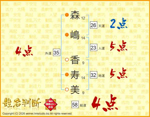 森(12画)嶋(14画) 香(9画)寿(14画)美(9画)