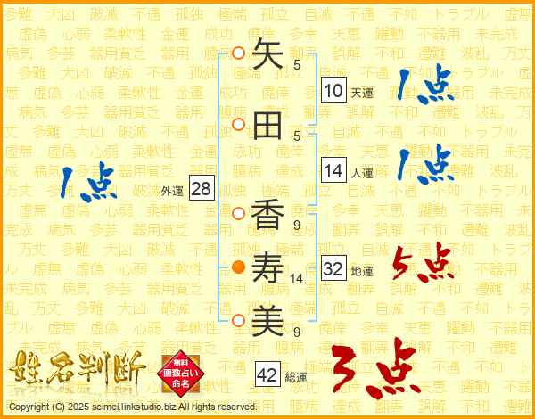 矢(5画)田(5画) 香(9画)寿(14画)美(9画)