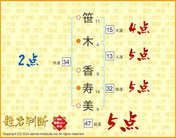 笹(11画)木(4画) 香(9画)寿(14画)美(9画)