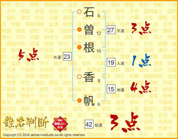 石(5画)曽(12画)根(10画) 香(9画)帆(6画)