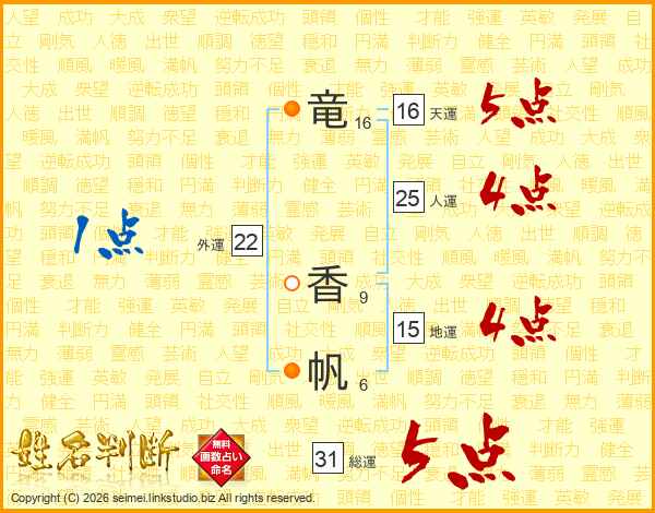 生活面を象徴する運勢です。外部から受ける影響力を表し、結婚運、家庭運や職場、環境への順応性を表します。総運から人運を引いた画数。姓や名が1文字の場合を除く。