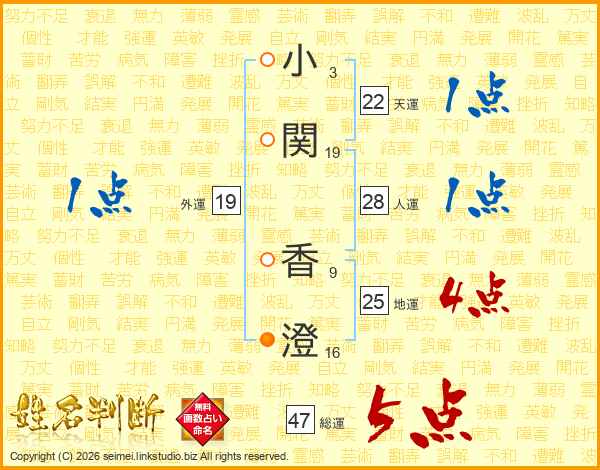 小(3画)関(19画) 香(9画)澄(16画)