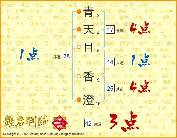 青(8画)天(4画)目(5画) 香(9画)澄(16画)