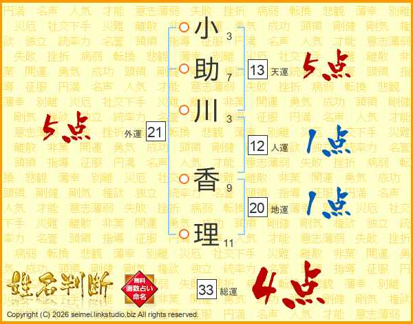 小(3画)助(7画)川(3画) 香(9画)理(11画)