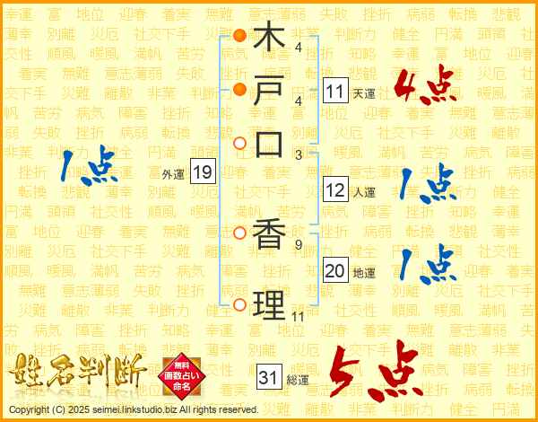 木(4画)戸(4画)口(3画) 香(9画)理(11画)