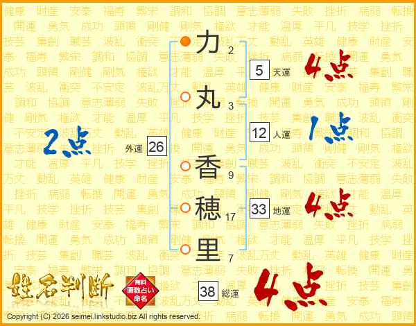力(2画)丸(3画) 香(9画)穂(17画)里(7画)