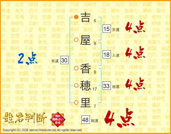 吉(6画)屋(9画) 香(9画)穂(17画)里(7画)