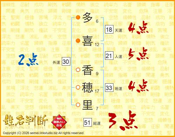 多(6画)喜(12画) 香(9画)穂(17画)里(7画)
