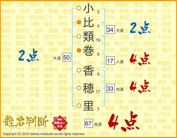 小(3画)比(4画)類(19画)巻(8画) 香(9画)穂(17画)里(7画)
