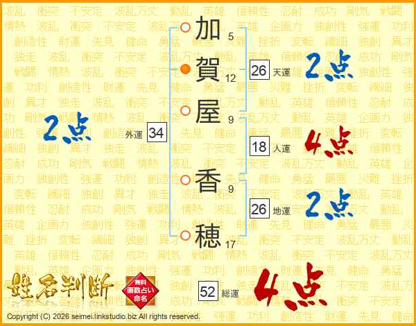 加(5画)賀(12画)屋(9画) 香(9画)穂(17画)