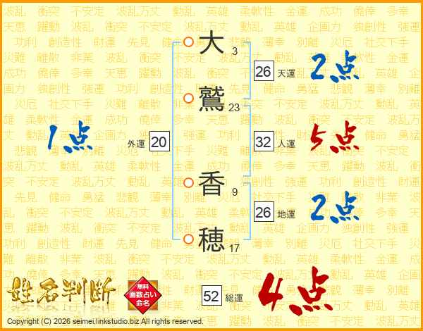 大(3画)鷲(23画) 香(9画)穂(17画)