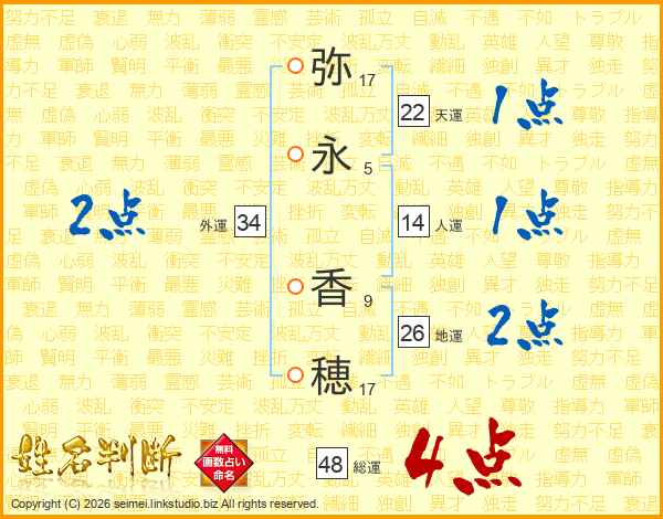 生活面を象徴する運勢です。外部から受ける影響力を表し、結婚運、家庭運や職場、環境への順応性を表します。総運から人運を引いた画数。姓や名が1文字の場合を除く。