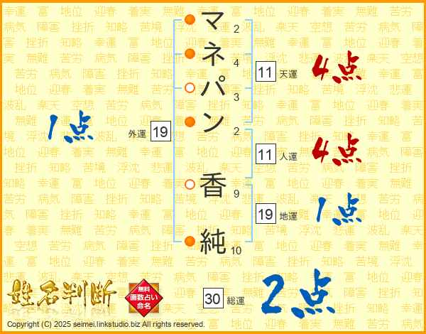 マ(2画)ネ(4画)パ(3画)ン(2画) 香(9画)純(10画)
