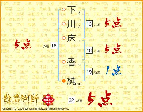 下(3画)川(3画)床(7画) 香(9画)純(10画)