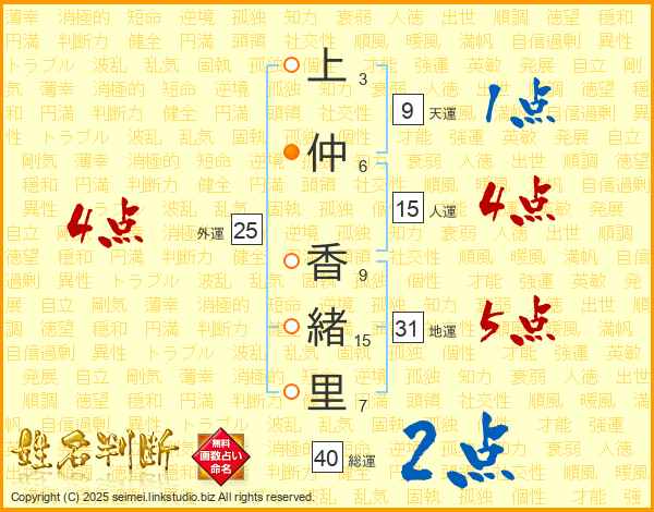 上(3画)仲(6画) 香(9画)緒(15画)里(7画)