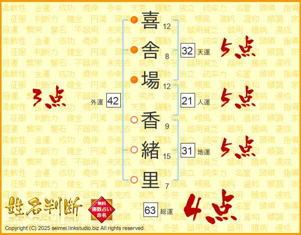 喜(12画)舎(8画)場(12画) 香(9画)緒(15画)里(7画)