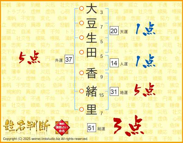 大(3画)豆(7画)生(5画)田(5画) 香(9画)緒(15画)里(7画)