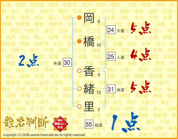 岡(8画)橋(16画) 香(9画)緒(15画)里(7画)