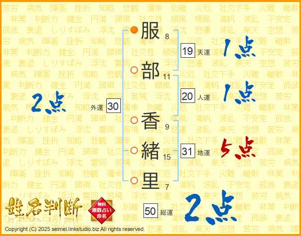 服(8画)部(11画) 香(9画)緒(15画)里(7画)