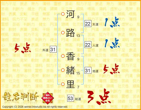 河(9画)路(13画) 香(9画)緒(15画)里(7画)