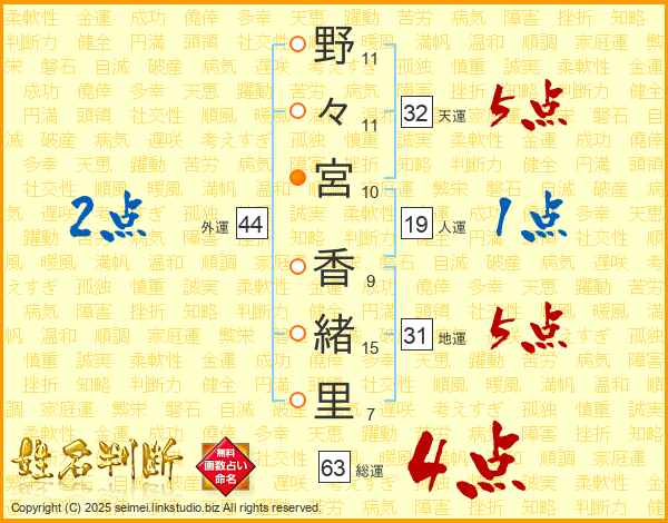 野(11画)々(11画)宮(10画) 香(9画)緒(15画)里(7画)
