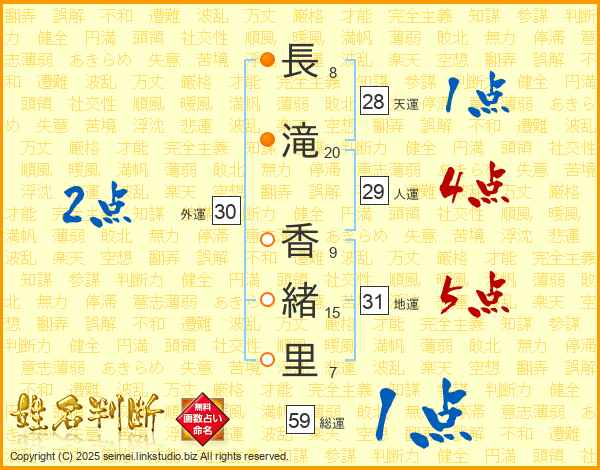 長(8画)滝(20画) 香(9画)緒(15画)里(7画)