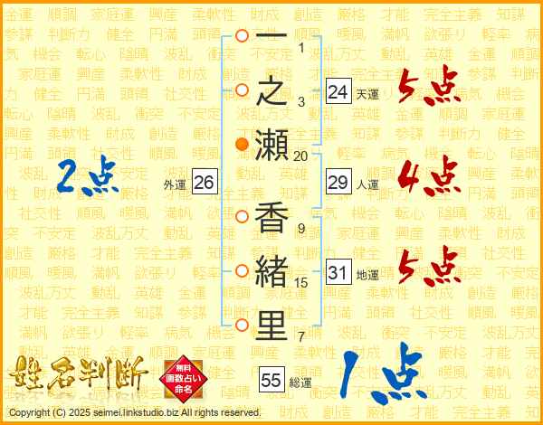 一(1画)之(3画)瀬(20画) 香(9画)緒(15画)里(7画)