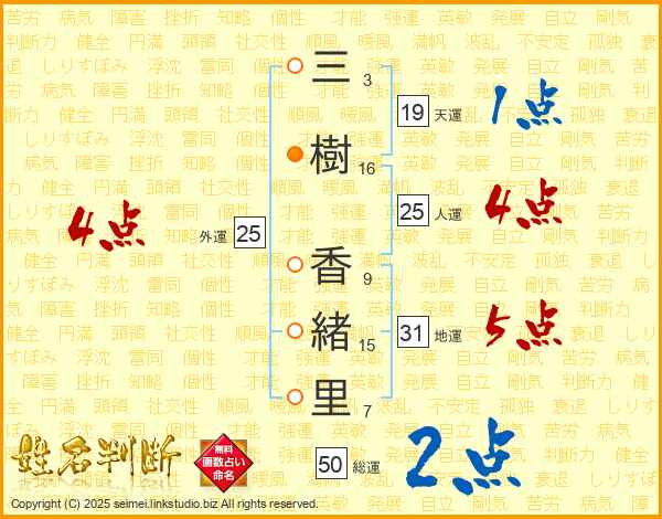 三(3画)樹(16画) 香(9画)緒(15画)里(7画)