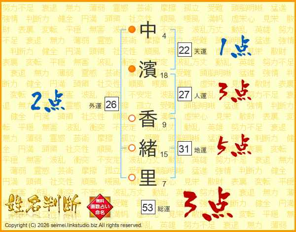 中(4画)濱(18画) 香(9画)緒(15画)里(7画)