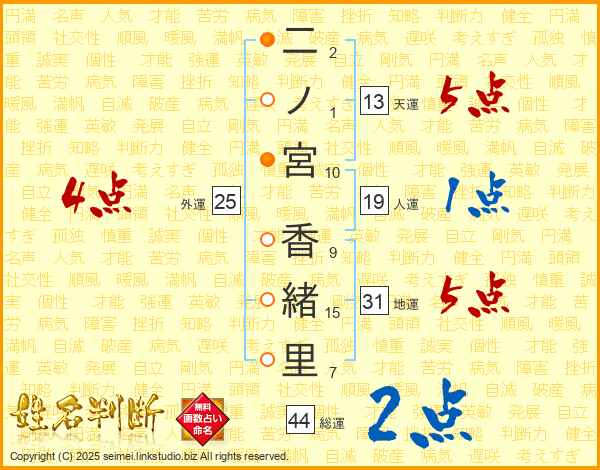 二(2画)ノ(1画)宮(10画) 香(9画)緒(15画)里(7画)