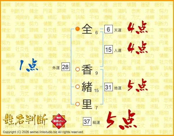 生活面を象徴する運勢です。外部から受ける影響力を表し、結婚運、家庭運や職場、環境への順応性を表します。総運から人運を引いた画数。姓や名が1文字の場合を除く。