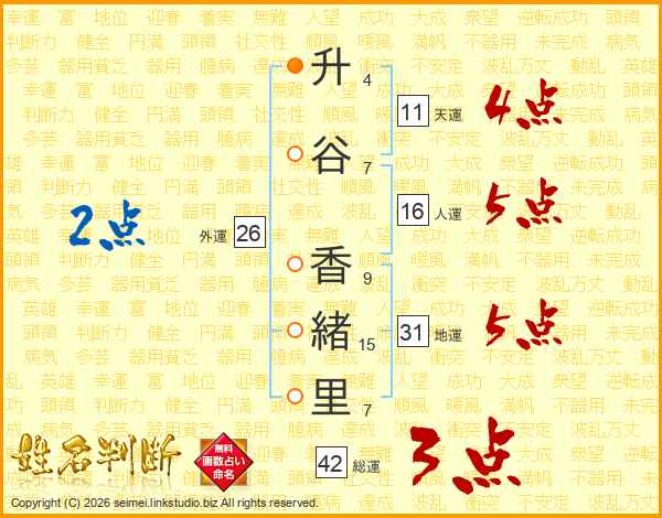 升(4画)谷(7画) 香(9画)緒(15画)里(7画)
