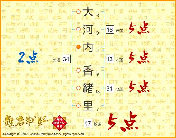大(3画)河(9画)内(4画) 香(9画)緒(15画)里(7画)