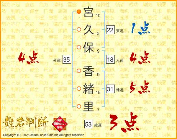 宮(10画)久(3画)保(9画) 香(9画)緒(15画)里(7画)